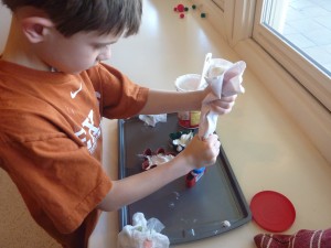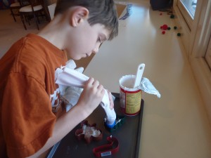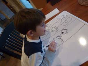 I think that if kids know that what they are putting down on paper is not the way they want it to look, they get frustrated and don’t really want to try anymore (kind of like me and baking!). For Andrew, using tools that make the writing easy to “wipe away†helped him slowly build up his confidence.  By removing some of the pressure, we could focus on the basics of the skill.  Now he loves his big white board where he can draw people and fans (his two obsessions right now) because he has an opportunity to practice while being able to easily rub unwanted lines or marks away.