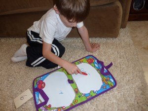 When I notice things like this, the teacher in me starts to analyze a bit. What is it about these toys/tools that make this activity more tolerable to him? What are his avoidance behaviors telling me when I bring out paper and pencil? I thought about the difference between them and I think the main reason is that since the Doodle Pro (or Magna Doodle), Aqua Doodle and white boards are not “permanent†like pencil/paper (at least in his eyes) it was not as daunting. It was no big deal to make some markings on them because they were easy to get rid of.  They were not permanent and if it didn’t turn out the way he wanted, he wouldn’t have to look at them for more than a few seconds.