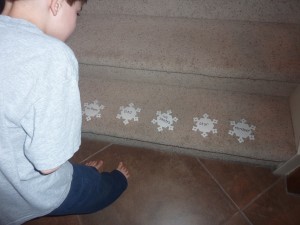Using the stairs for a "Climb and Match" activity.