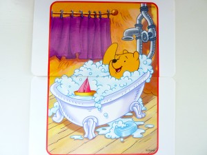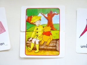 I like this because it takes the parent aspect out of the picture a bit – it’s not me determining that it’s right or wrong. If the picture doesn’t match, it is not the correct choice. With this particular game, when the correct match is made and the cards flipped over, they make a picture of Winnie the Pooh characters in a scene using the objects that “go together.” Â This is great because we can find the objects in the picture and talk about how they are being used together to help out the characters.