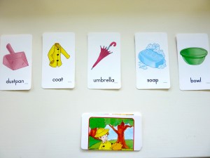 This is such an easy station activity to set up and can give a lot of information about a child’s ability to determine which objects go together. These cards allowed me to learn about Andrew’s knowledge of things and what experiences we needed to introduce him to. We could talk about how the things were being used with some favorite characters and most importantly, we were having fun together as we flipped the cards over to make pictures. I have to say my $2.00 Walgreens purchase proved to be a wonderful investment!