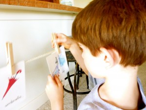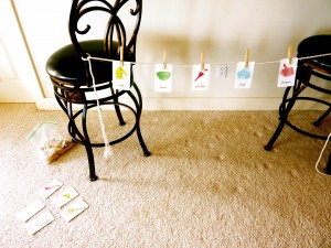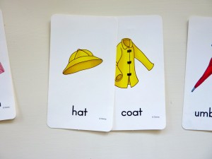 This station activity allows you to combine the concept of things going together with the fine motor skills and motor planning that are necessary when using clothespins to clip two cards onto the clothesline. Â (Click here to see a previous post on using clothes lines.)