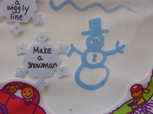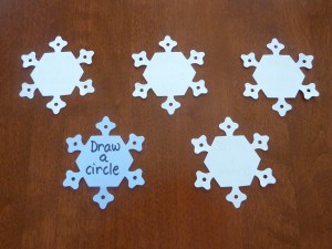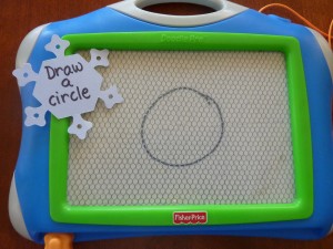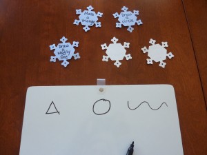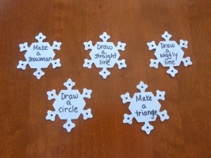 I used some calendar cutouts that I had and wrote a basic drawing skill that I wanted Andrew to work on. Â This particular station was done during a winter themed Obstacle Course which explains the snowflakes. Â This could also be done using index cards, strips of construction paper, ideally something that you cannot see through.