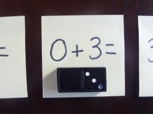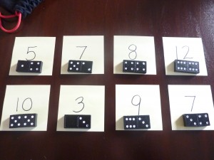 - I wrote out the total number of dots from each domino on a Post-It Note and arranged them at the station in random order. Â You could put them in number order as well, I just wanted him to be really looking at the number on the paper. Â Note: Â Instead of writing the numbers or facts for them, you could provide a white board or chalk board and have them write the numbers or facts as they pull them out to build writing skills.