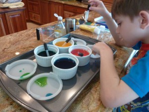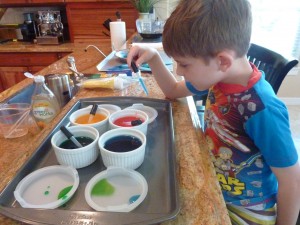 I used one of my rimmed cookie trays (I have to use them for something since I don’t bake!!), some ramekins (If you worry about breaking the ramekins, you could also use small Dixie or plastic cups or bowls.) and added a few drops of red, yellow and blue food coloring in: red, yellow and blue food coloring. I did this part with Andrew so he could also work on stirring but you could do this for them or ahead of time.  It is kind of cool for them to see the water take on the color of the food coloring drops.