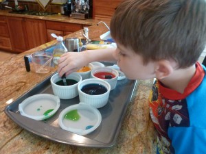 I decided that I would set up a My Obstacle Course station that would combine the droppers with making colors. This station activity was not only easy to set up and take down, it was also a huge hit!  Andrew’s exact words were, “This is fun. It is just like Easter!â€