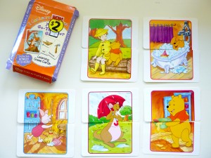 I like this because it takes the parent aspect out of the picture a bit – it’s not me determining that it’s right or wrong. If the picture doesn’t match, it is not the correct choice. With this particular game, when the correct match is made and the cards flipped over, they make a picture of Winnie the Pooh characters in a scene using the objects that “go together.” Â This is great because we can find the objects in the picture and talk about how they are being used together to help out the characters.
