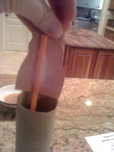 I then took an empty paper towel tube (or a toilet paper roll) and placed the groundhog inside so he could “pop” out to see his shadow. Â I explained and showed him with a flashlight how the sun, and other light, creates shadows.