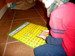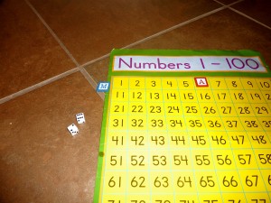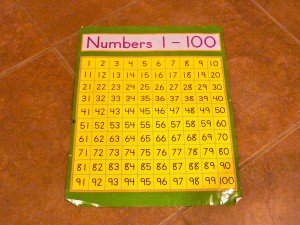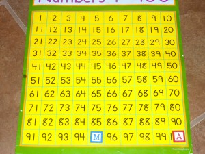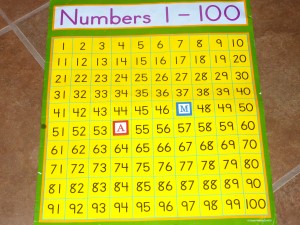 Last year Andrew brought in 100 colored puffs (He loves colored puffs almost as much as I do!) and this year he decided to bring in a 100’s chart poster. Â He found it in my supplies and squirreled it away to his room. I purchased this chart in order to work on numbers with him by playing a game that is so simple it’s almost funny. I did this game with my kindergarteners and it was a great way to work on number recognition, number order and adding on from a certain number. This could also be played in reverse to work on subtraction. I thought it would be a great extension activity to reinforce at home what he is doing at school.