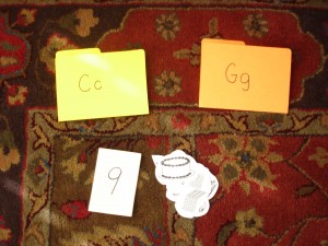 I printed out the pages of the beginning sound we were working on (click here to see page), cut out the pictures that began with those sounds and then mixed them up. I got some cute little file folders at the teacher store, wrote one letter on each folder and placed out the folders for the letters we were doing. We would say the name of the picture and decide which beginning sound it had and place it into the correct folder. This really allowed me to see which sounds he was hearing and because all of the pictures were stored in the folders, it was so easy to mix and match letters/sounds in other Obstacle Courses. This also helped build his vocabulary and picture recognition because some of the things were new or looked different on paper.