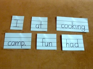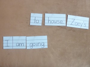 When I began working with Andrew on putting words together to form complete sentences, I thought it would be best to write about things that he was doing or had done that day. I felt that keeping it extremely relevant to his world would help him figure out if it made sense. I wrote a sentence, cut apart the words and set them out. At first, I placed the first few words out so all he’d have to do was finish it. Eventually he would look at the words, think about what it could say and then placed them together to form a sentence.
