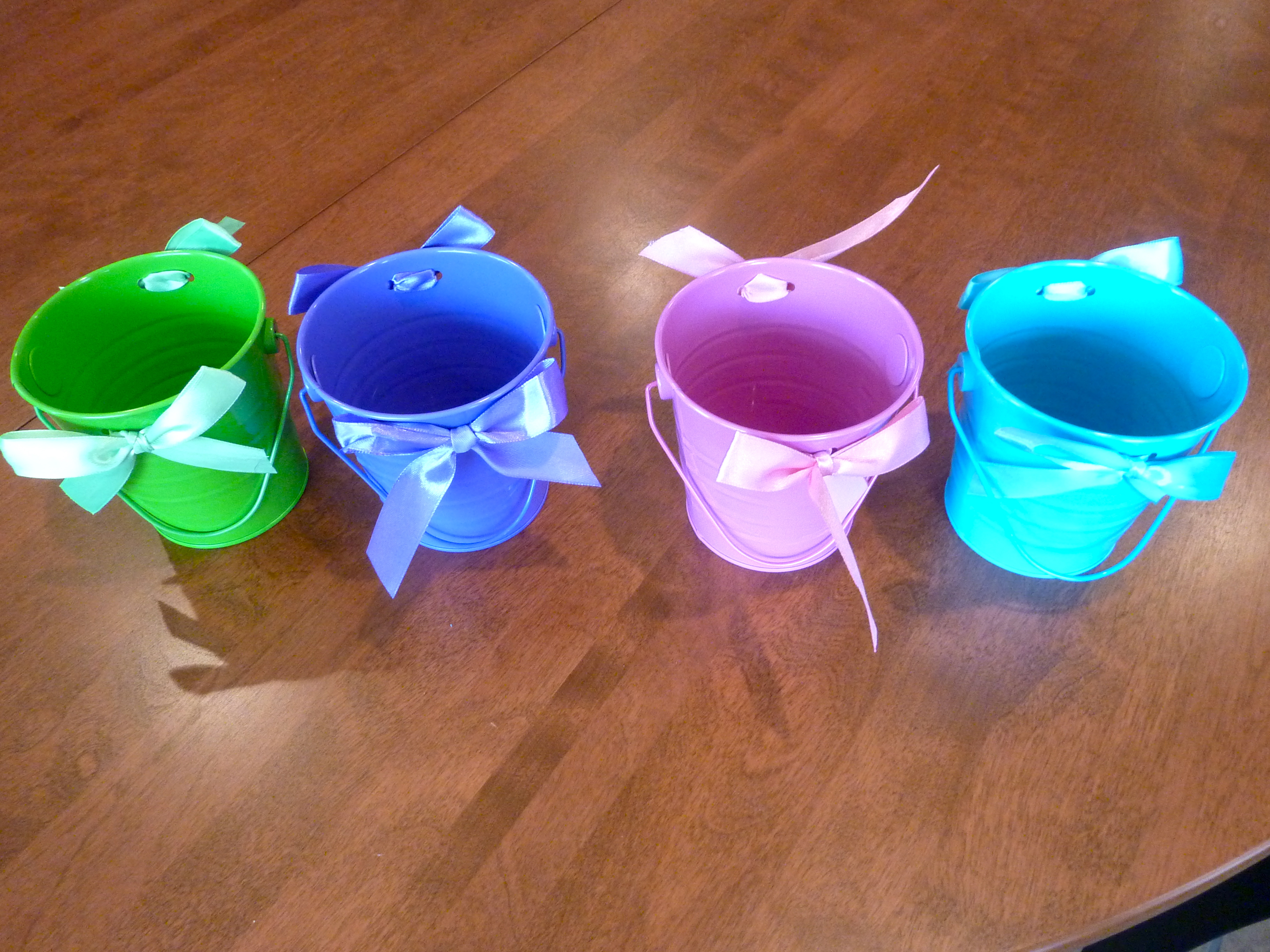 I found these spring colored pails at Target and thought they were so cute but in all honesty, at first I said to myself,”Well, he doesn’t like to dig in the sand or dirt. That’s really too bad!” But then as I took another look at them, I realized that I could use them in so many other ways with him; ways that had nothing to do with things that are messy! So now, I notice things at stores that I would never have noticed before, and think about all of the possible new uses for basic things.