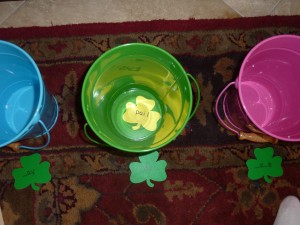 - I used some spring colored pails from Target so he would have a place to sort the words into. This also helps me because after he sorts them and before we move on, we go through each pail’s words, read them out loud together and I can double-check to make sure they were all correctly sorted.
