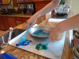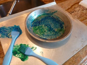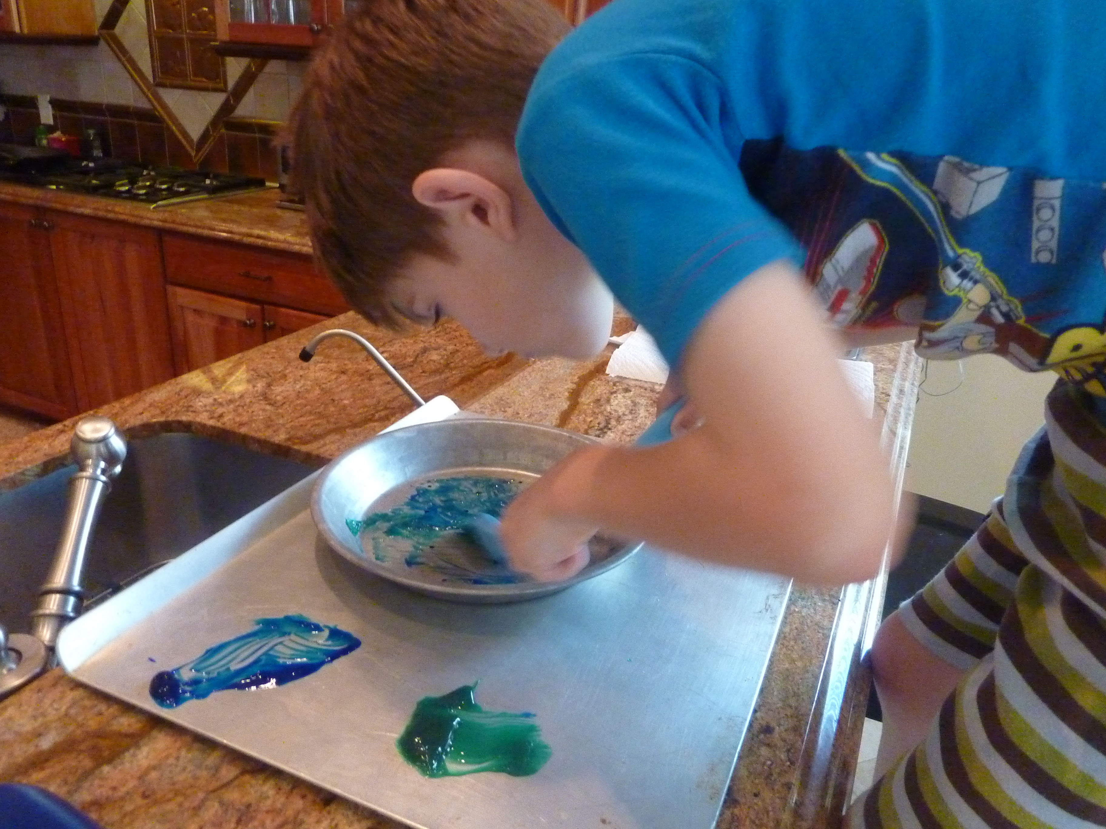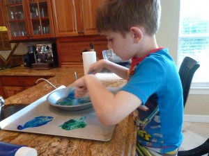 I placed some washable finger paint on the cookie sheet (or on another paper plate if that’s what you are using underneath). I used blue and green paint because he had been learning about the planets in school and the station direction was to paint the planet Earth.
