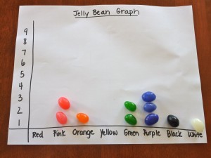 For this station activity, make your graph sheet and place some jelly beans inside the plastic egg. You can choose specific amounts or just pour some in to see what you get. I frequently choose some colors to have the same amounts to work on the concept of “equal” as well as having certain colors be empty for the concept of “Zero.” It is up to you but after doing this sort of thing for a while, you may find yourself becoming more strategic with things like this to use as teaching opportunities.