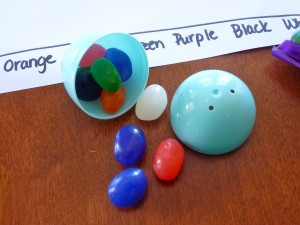 You could provide a container for them to place the jelly beans in after they find them. I may even use a different color grass in another bowl to make a nest for the pretend play add-on I describe below.