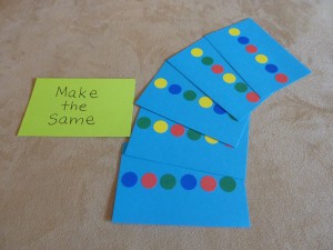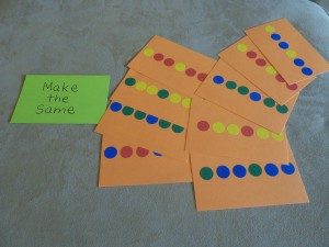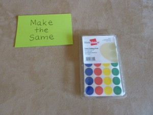 At the station, I provide paper and stickers, have him choose a pattern card and using the stickers, he peels and sticks the dots on to make the same pattern. If this activity is easy for him, I would have him choose several different cards to do. If it is too challenging, I would limit it to two.
