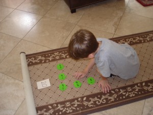 Years ago, during a course for teachers in my county, I first learned about how cross patterning and crossing the mid-line of one’s body can help students make connections to help them remember things. I heard this again at a brain conference years later, where they emphasized the importance of creeping, crawling, running, swimming, monkey bars – basically any type of activity that utilized both sides of the brain at the same time. I also found it fascinating that the distance from our eyes to the ground when crawling is about the same distance from our eyes to materials we read. I figured that increasing physical activity is never a bad thing and I was hopeful about this considering Andrew’s limitless energy. However, when I returned home and was trying to encourage him to crawl around the house with me, he was not having any of it. I realized that if I wanted him to do this, I needed to do something to make crawling purposeful and came up with this activity.