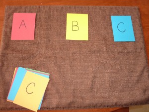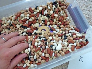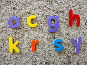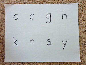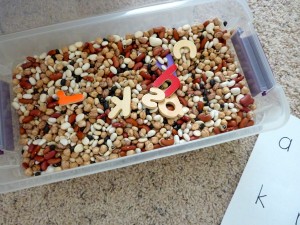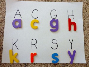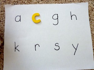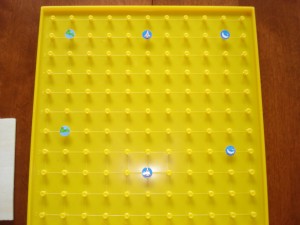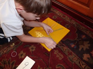 I found my geoboard at the teacher supply store but this is something that could also be done using a thick piece of styrofoam with some screws, nails or golf tees secured into the foam so they are firm and don’t wiggle. They can be placed randomly or in an orderly fashion, whatever you like. Just provide some rubber bands for your child to secure around the screws, nails or tees and you can help them build fine motor skills! (Here is a previous post I did combining styrofoam, golf tees and a hammer called Hammer Away!)