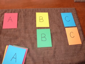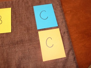 I placed small stickers on the pegs I wanted him to put the rubber band around. Each pair of stickers matched so he’d know which ones to connect. Some were closer together and others farther apart so he’d have to stretch the rubber band a bit more, working on doing it so the rubber band didn’t fling off!