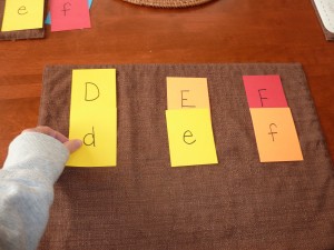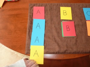 I modeled what we were going to do before giving him the rubber band. Working with rubber bands requires more attention from the adult so it doesn’t hurt them or someone else. Like I said, I knew that it was going to be challenging for him so I did hand over hand while also holding one end of the rubber band on the peg so it wouldn’t come off. His job was to stretch the rubber band and fit it around the peg with the matching sticker. It was great for him to feel the tension and push himself to pull it farther. He wanted me to do it for him but I simply helped his hand stretch it so it would reach around the peg.