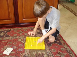 The “geoboard” is something that is found in most elementary school classrooms and is generally used for the purpose of building math skills like making geometric shapes and finding area and perimeter. This is something that I will definitely work on with Andrew someday but when I looked at this tool I realized that it would be a fun way to help him build his fine motor skills and fine motor planning.
