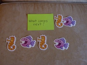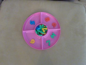 I found these bright, colorful, plastic party trays last year (I think at Michael’s but I cannot remember for sure 🙁 ). You can pair one of these trays with items like colored puffs, thematic felt stickers, goldfish crackers, buttons, beads, or anything that can be sorted by a specific characteristic (color, size, etc.) and you have an easy My Obstacle Course station activity.