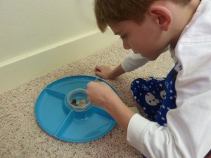 For this activity though, I went through and chose some words to build and took them out of the pack. I flipped them over to make it more of a game, giving him the choice of which card to flip over first and set out the letters he would need to make the words. The set up for this only took a few minutes and could be done with basic word families (click here for a list of common word families on EnchantedLearning.com), spelling or Word Study words, thematic or unit study vocabulary words or words that go with a speech sound your child is working on.