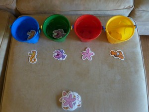 I found these colorful pails at Michael’s and while they are meant for playing in the water and sand, they are also perfect for a sorting station. So colorful and they stack nicely for storage purposes.
