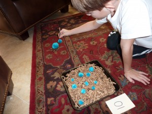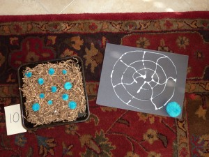 This was a really easy station to put together using tweezers, some brown shredded paper and colored puff balls. That is it! You don’t even need the shredded paper, you could have them scattered about on a cookie sheet or foil tray in salt or sand and pretend they are lost in the snow or desert.