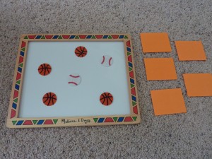 I found these really cute sports stickers at Michael’s and while they are probably meant for some art project (like a picture frame) or a scrapbook page, I got them to help build math skills like patterning, sequencing, counting and building math vocabulary.
