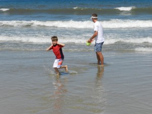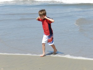 Note: Andrew does not have fear of water. He knows how to swim and is very comfortable in the water. If he did not know how to swim or had water fears, we would have placed focus on something else because going into the ocean would have been too big. This was a sensory processing issue for him, working to deal with the noise of the ocean, the feel of the cold, scratchy water on his legs and the unpredictability of the waves. You can see that he is plugging his ears to lessen the noise and as the week progressed became more comfortable with the patterns of the waves, which we pointed out to him. Not much to do about the scratchy water other than get used to it! 🙂