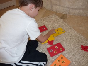 These cards could be put together in pairs to build concepts like “more” and “less” through questions like, “Which has more, apples or pumpkins?” Throw in a “greater than” or “less than” sign and you can build yet another skill! See how something so basic as colored index cards and seasonal stickers can really help to build math skills in a fun, kid-appealing way? Love it!