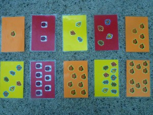 For the autumn-themed number cards, I decided to use colors that represent autumn for me – red, orange and yellow (you could use any cards or colors that you’d like), and I used some apple, pumpkin and leaf stickers. If this is too busy for you or your child, you could use just one color of index card or one kind of sticker for a set of cards (ex. a set of apple number cards, a set of pumpkin number cards and/or a set of leaf number cards).