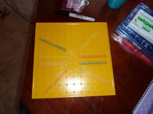 I had some packages of Halloween themed stickers (could be any theme at any time of the year though) and got out some orange index cards. I began a pattern using the stickers (shown in the photo) and when Andrew got to the station, he looked at the pattern, found the sticker that went next, peeled it and worked to stick it on the card.