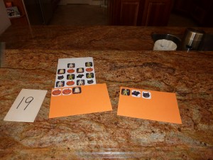 I had some packages of Halloween themed stickers (could be any theme at any time of the year though) and got out some orange index cards. I began a pattern using the stickers (shown in the photo) and when Andrew got to the station, he looked at the pattern, found the sticker that went next, peeled it and worked to stick it on the card.