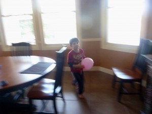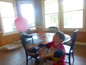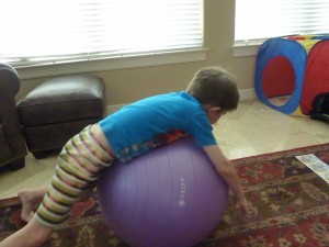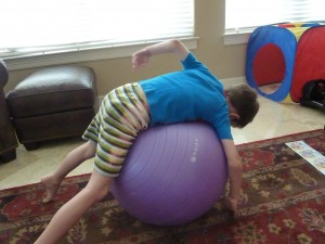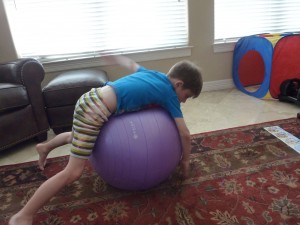 While lessons didn’t go well, I did notice that his left arm did not come out of the water in the same way that his right arm did. When he swims, he tends to use his arms together in a “breaststroke” technique to get to the bottom of the pool as well as anywhere else he wants to go. I wanted to be able to work on this with him and give his arms some practice with different swim strokes. We are lucky to live somewhere warm and have access to pools, but it’s not always ideal and thought about using my exercise ball to work on this as part of My Obstacle Course. We did and it worked great!!