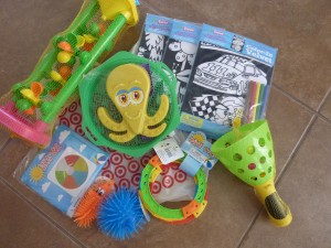 Water/sand wheel, sand play kit with sifter, velvet coloring pages, pop up ball catcher, dive rings, squishy ball and caterpillar that lights up and a beach ball.