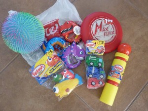 Large squishy ball, dino-squeezers, frisbee, water blaster, water squeezers – truck shapes and fish shapes.