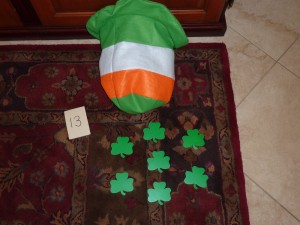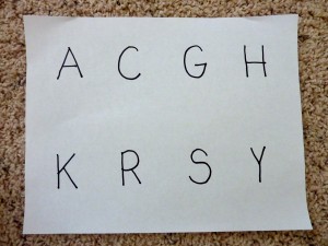 I include a sheet with the letters on it so they can be matched up and so that he knows how many more he needs to find. This does not have to be fancy, just a sheet of paper with the letters neatly written on it or even printed from the computer using a large font size.