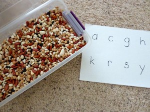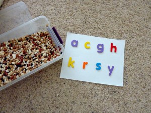 If your child knows their letters, an extension of this would be to place letters into the bin that form a word. Write the word on a piece of paper or a piece of a sentence strip and the child can put the letters in the correct order to form the word.