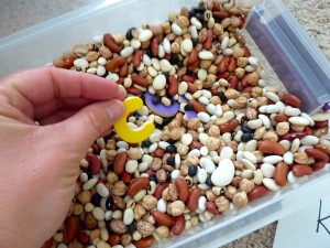 I combined these with a sensory bean bin that I have made. (Now that summer is approaching, it might be fun to go with the summer theme and make a sensory bin with sand! Just remember to put a towel or sheet underneath it for easy clean-up.)